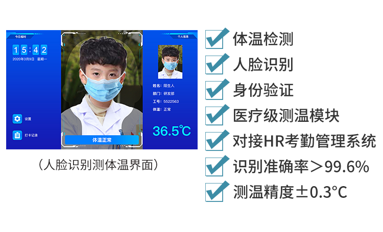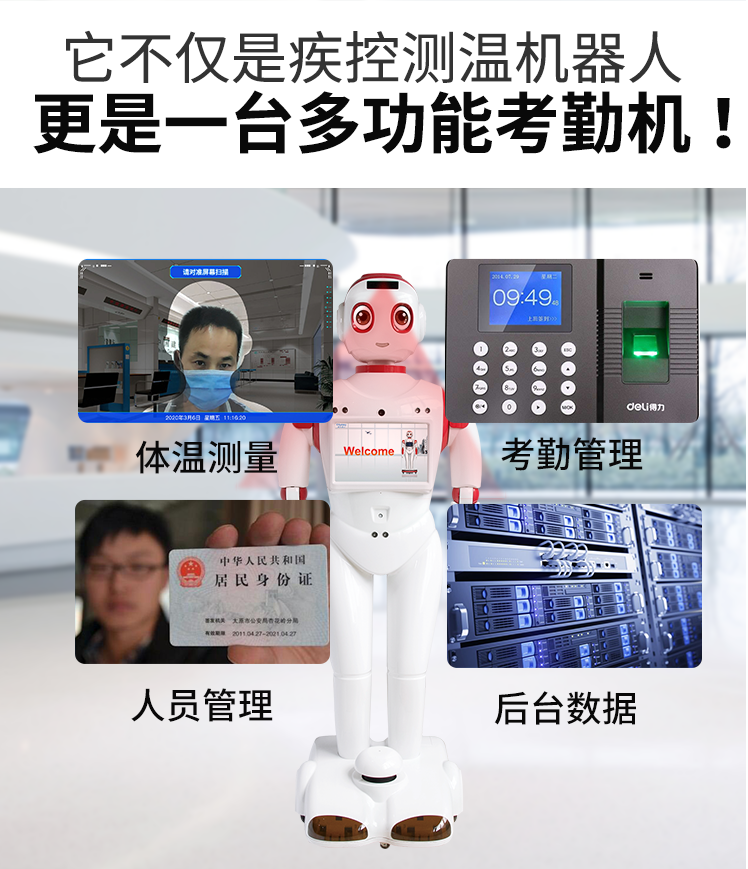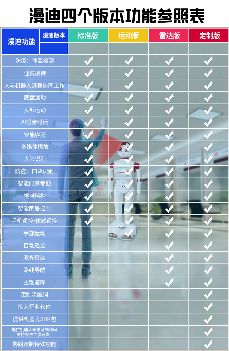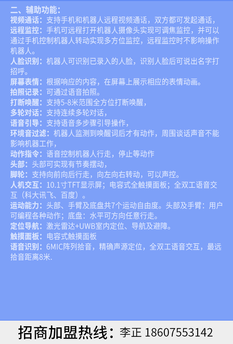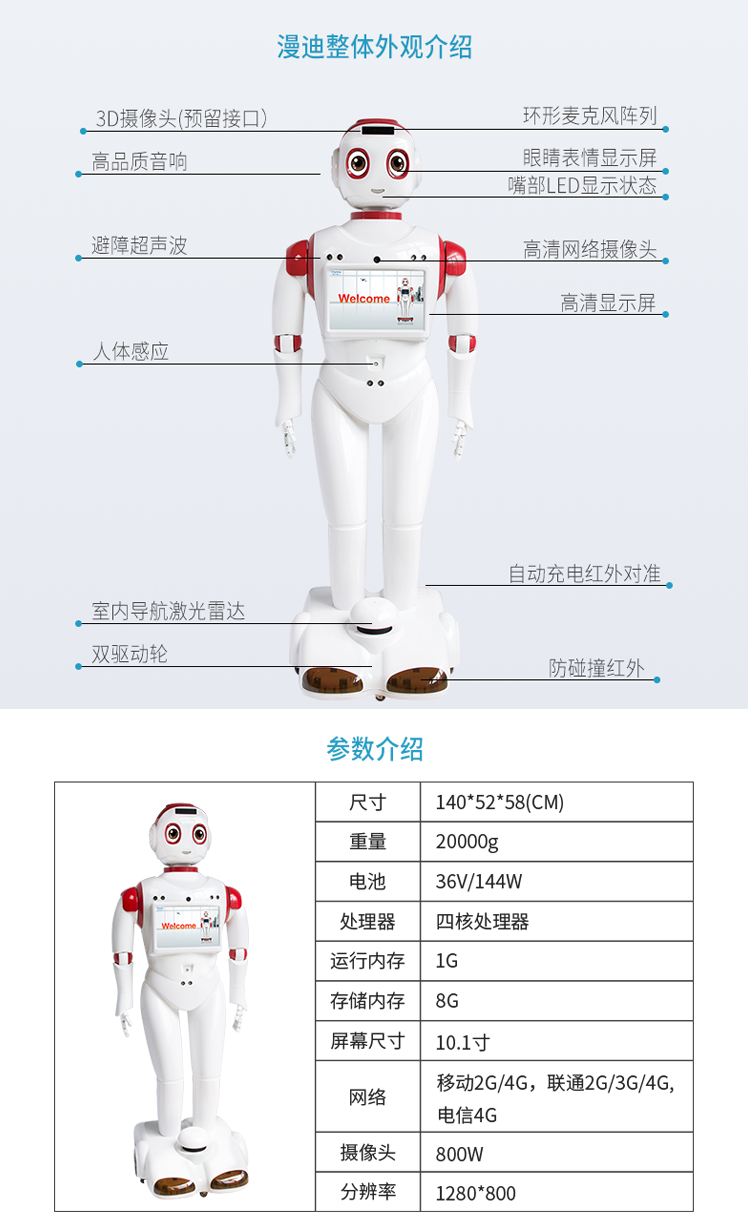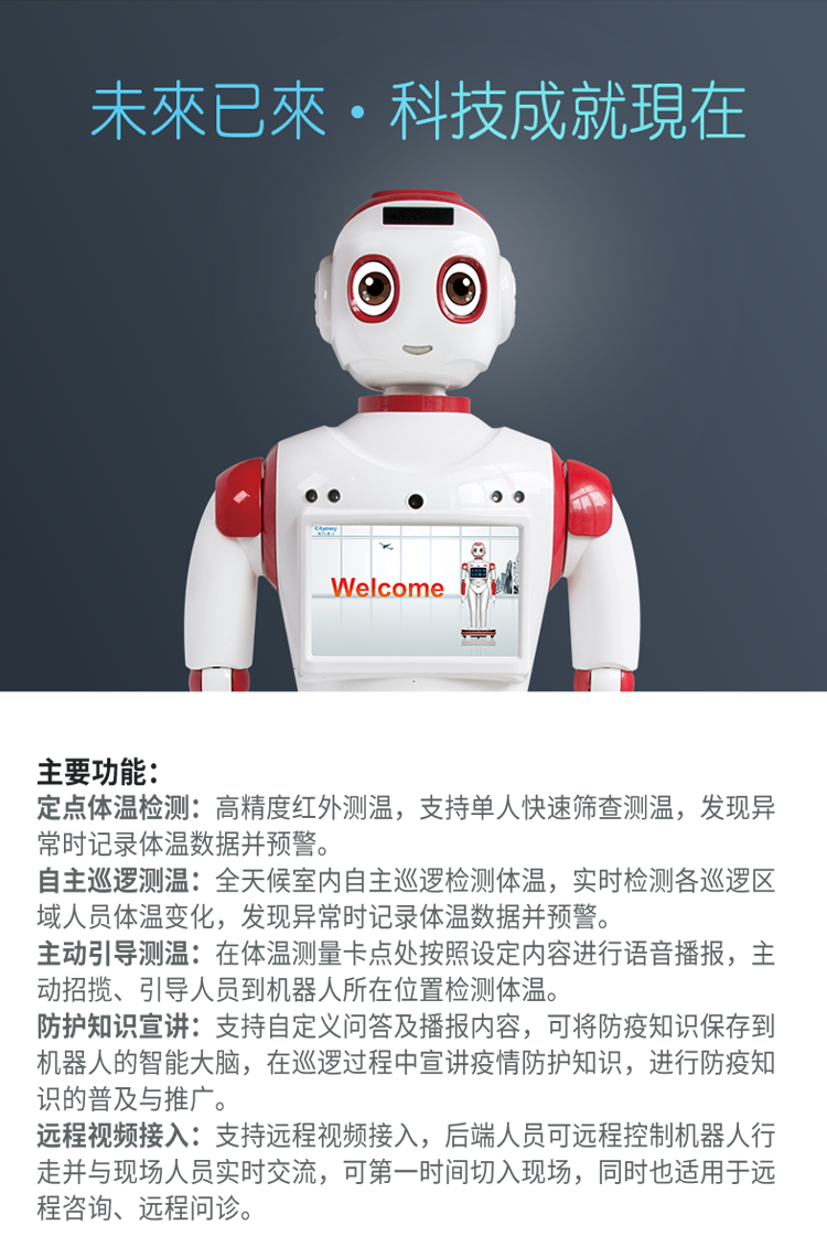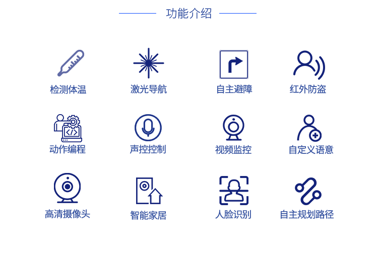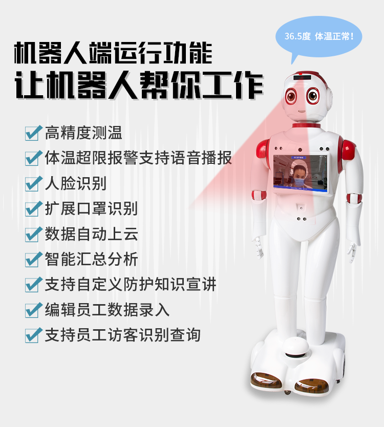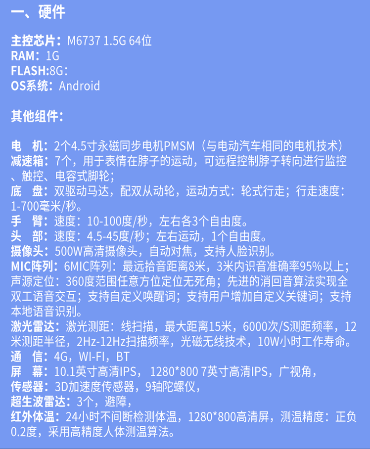 高清摄像头,人脸识别,体温检测,口罩识别,红外防盗,自主避障(超声波),互联网应用,立体音响,智能家居控制,激光导航