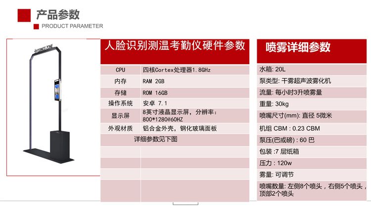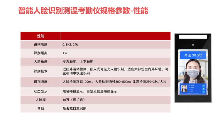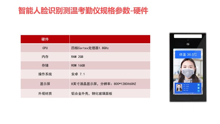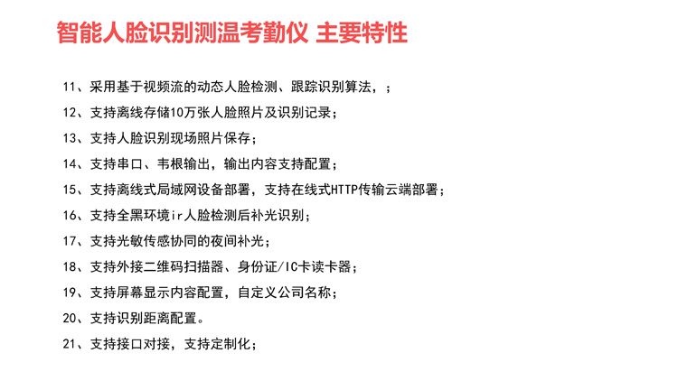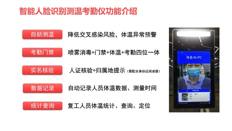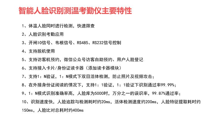 人脸识别,红外测温,考勤门禁,智能预警,数据管理,追溯筛选,高清触屏,大容量储存